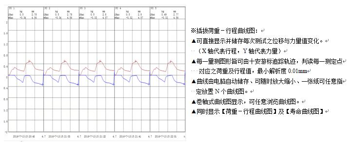 荷重–行程曲线图、寿命曲线图、测试报表、皆为A4标准纸张规格,且由电脑打印机直接列印。